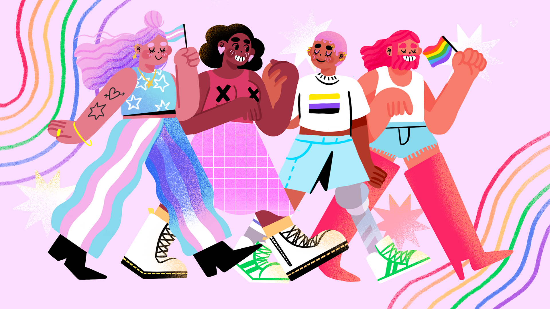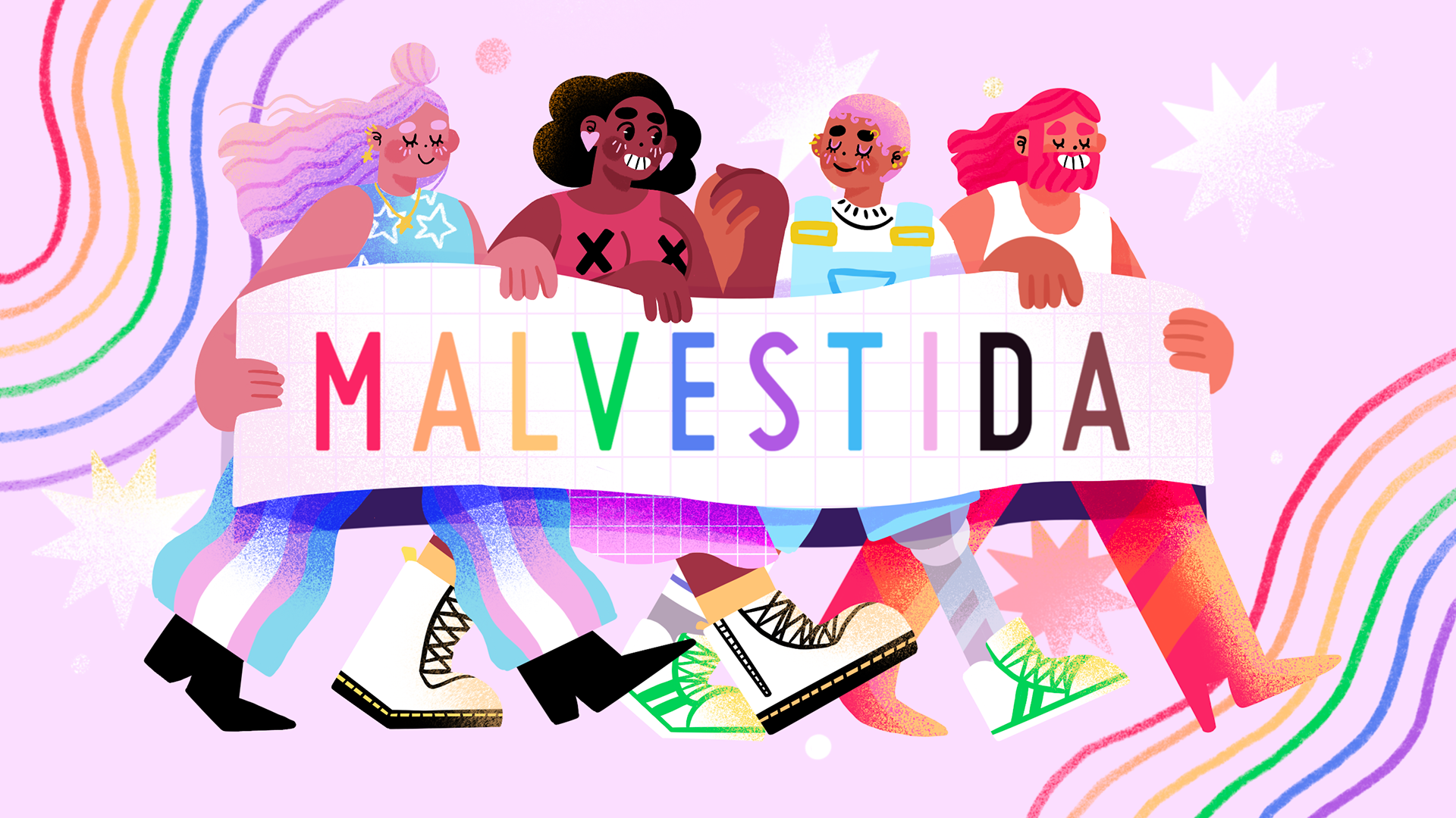 An illustration for Pride Month for the page of Malvestida, showing a group of diverse people all together walking by each other's side.